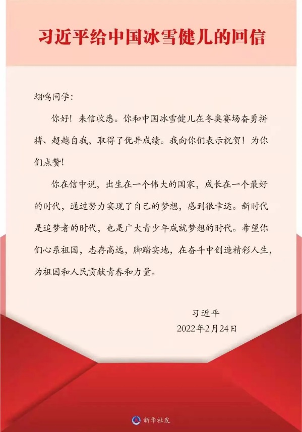 中共中央总书记、国家主席、中央军委主席习近平于2月24日给中国单板滑雪运动员苏翊鸣回信,向他及中国冰雪健儿取得的优异成绩表示祝贺,并提出殷切期望。色情漫画 组织各团学组织通过多种方式学习感悟习近平总书记回信精神。