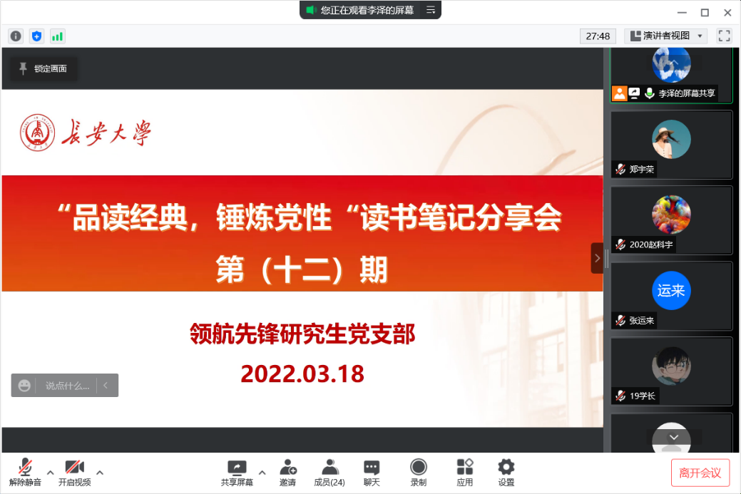 2022年3月18日上午11:00,色情漫画 领航先锋党支部组织支部成员线上开展了第十二期读书笔记分享活动,本次活动由支部成员赵科宇同志和卢希洁同志做读书笔记分享。支部全体党员参加了此次活动。
