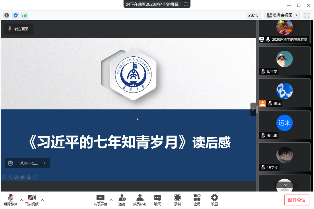 首先,赵科宇同志分享了《习近平的七年知青岁月》。该书讲述了1969年至1975年,习近平总书记在陕西省延川县文安驿公社梁家河村插队期间,同乡亲们一起劳动、生活,和乡亲们成了一家人的回忆性纪实。赵科宇同志表示:正是陕北这段艰苦的生活磨炼,锤炼了习近平总书记坚忍不拔、坚毅刚强的性格,铸造了他自强不息、志存高远的情怀,使他成为在艰难环境和曲折经历中成长起来的党的领袖。这启示我们,经历就是财富,苦难也是锻炼,勇于迎接挑战,敢于摔打自己,在实践锻炼中激发潜能、积累经验,磨砺意志、增长才干,打牢成长的根基。