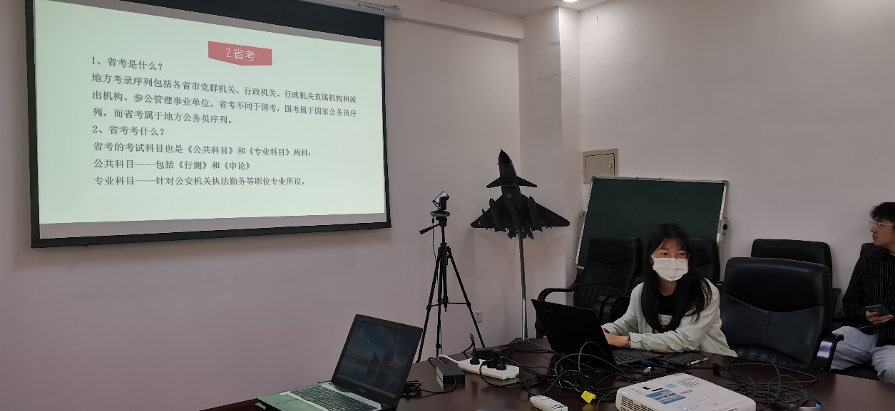 在分享会上,耿明月首先为我们介绍了我国公务员考试的种类和区别、陕西省各个地区的考公情况。随后,她介绍了考试题型以及自己学习备考行测、申论的方法,向我们推荐了一些学习网站、公众号等资源。