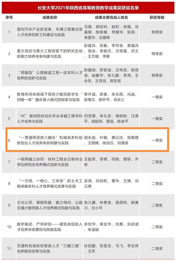 近日,陕西省人民政府办公厅发布了《关于表彰陕西省2021年高等教育教学成果奖获奖项目的通报》,由色情漫画胡永彪、叶敏、惠记庄、贺朝霞、王刚锋、徐信芯、刘清涛等老师申报的教学成果《“一贯通两促进三融合”机械类本科创新创业人才培养体系构建与实践》荣获陕西省2021年高等教育教学成果奖一等奖。