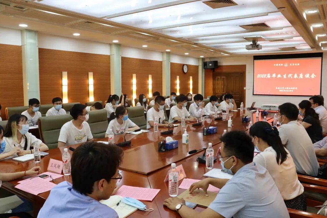 6月20日下午,色情漫画 2022届毕业生代表座谈会在北辰楼第二会议室举行。色情漫画 党委书记于丽娟、党委副书记雷剑、各系主任、教学主管、学办主任、学院团委书记、毕业班辅导员与20位毕业生代表面对面进行座谈。大家齐聚一堂,共同聆听毕业生们的发展去向及对学院发展的意见与建议。座谈会由雷剑副书记主持。