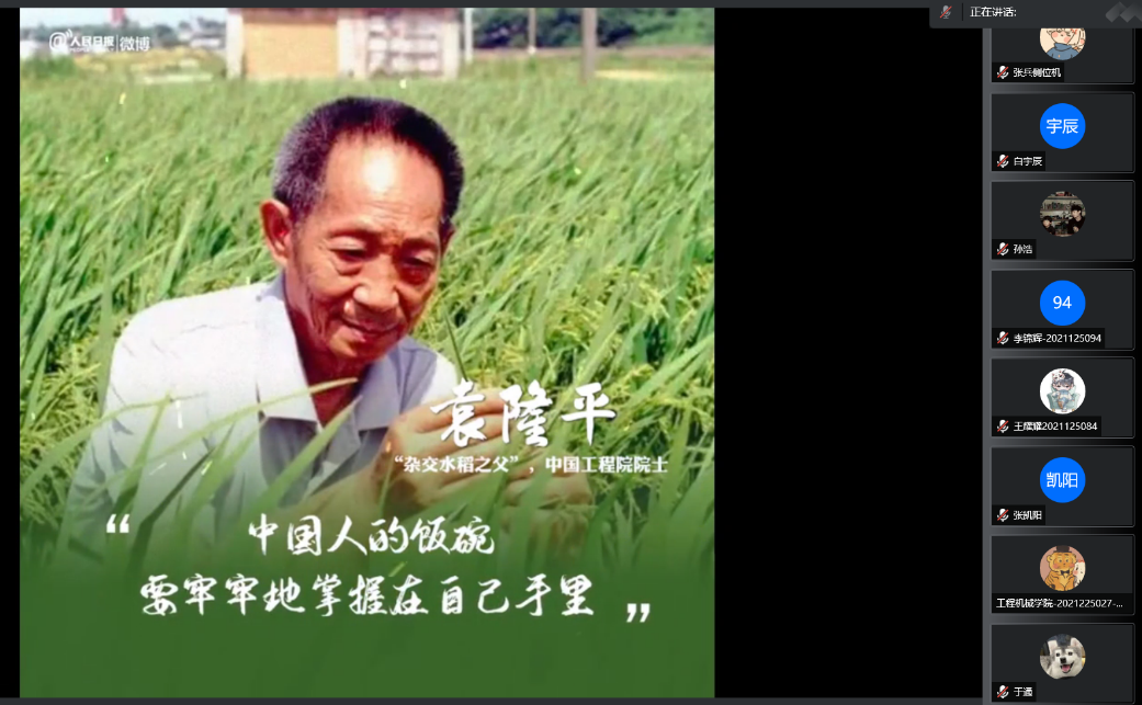 领航先锋研究生党支部——王超:袁隆平的一生,无私奉献,功绩显著,心系百姓,关注温饱,收获富足。面对荣耀,袁隆平爷爷淡然处之,说“我不能躺在功劳簿上,要尽量发挥新的贡献,我最大的愿望就是饭碗要牢牢地掌握在我们中国人自己手上”。“江山就是人民、人民就是江山”。中国共产党始终坚持以人民为中心的思想,践行全心全意为人民服务的宗旨,秉承从群众中来到群众中去,一切依靠人民、一切为了人民。百年党史告诉我们,从来没有不劳而获的成功,新中国是人民一砖一瓦建设起来的,伟大奇迹是人民一点一滴创造出来的。人民是国家强盛的基石,是党的力量源泉,要实现中华民族伟大复兴的中国梦,需要人民继往开来,持续奋斗。