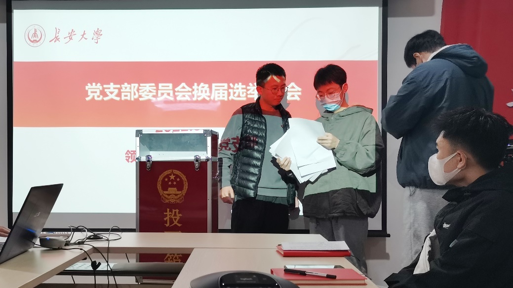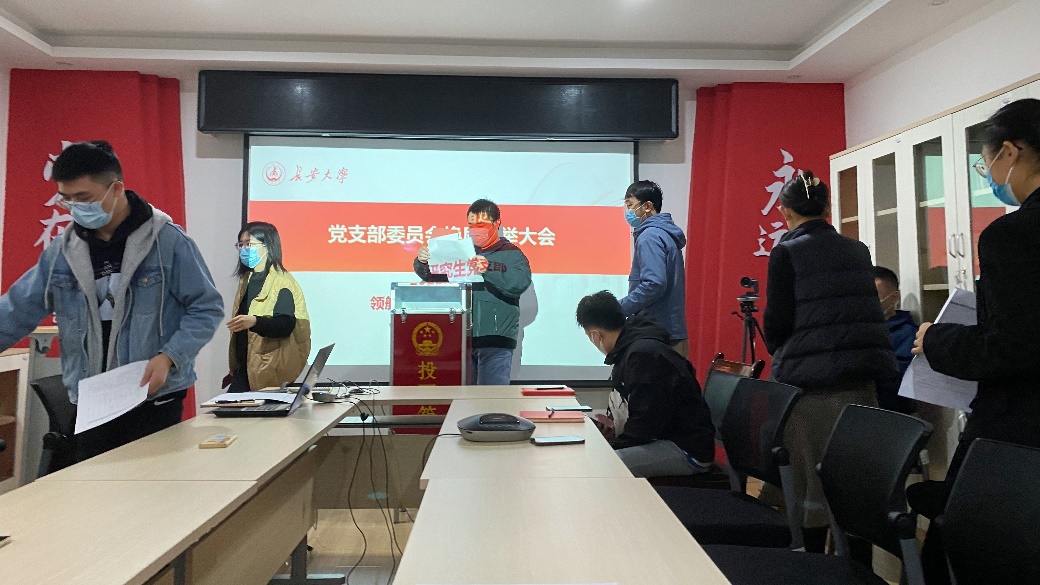首先,李泽宣读党组织委员会选举办法,确定了监票人、计票人等相关工作人员。随后李泽宣读了候选人名单并汇报候选人情况,宣读投票方法后开展换届选举工作。经支部大会充分讨论、发表意见并由正式党员无记名、差额投票表决,选举产生新一届支部委员会成员为王晨光、周文、郑宇荣、高婷婷。随后新一届支委成员召开第一次支委会,经支委会讨论,确定新一届支委会分工:领航先锋研究生党支部书记为高婷婷、副书记为周文、组织委员为王晨光、宣传委员为郑宇荣。