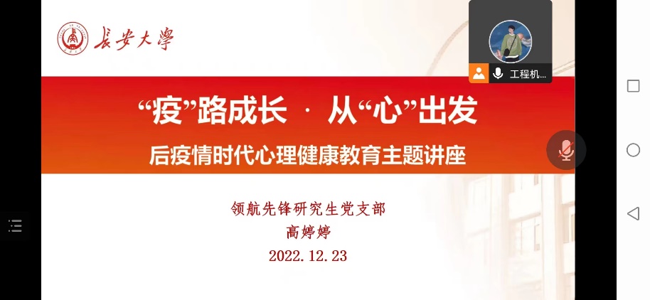 2022年12月23日上午10:00,色情漫画 领航先锋党支部组织开展“疫”路成长·从“心”出发——后疫情时代心理健康教育线上主题讲座。本次会议由支部副书记周文主持,支部书记高婷婷讲专题讲座,支部全体党员参加了此次活动。