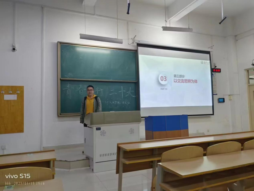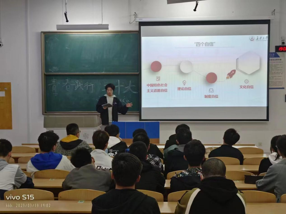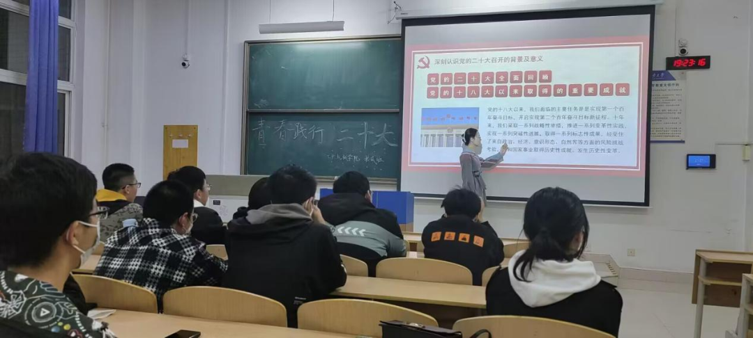 首先,班长黄磊带领大家回顾了党的二十大报告的主要内容,并对党的二十大精神做出系统化的总结,使同学们深刻领悟到党的二十大精神,以及党的百年奋斗路程和取得的一系列成果。会上,班长通过两段短视频向同学们展示了平凡人也可以为祖国的繁荣昌盛贡献力量,发人深思。