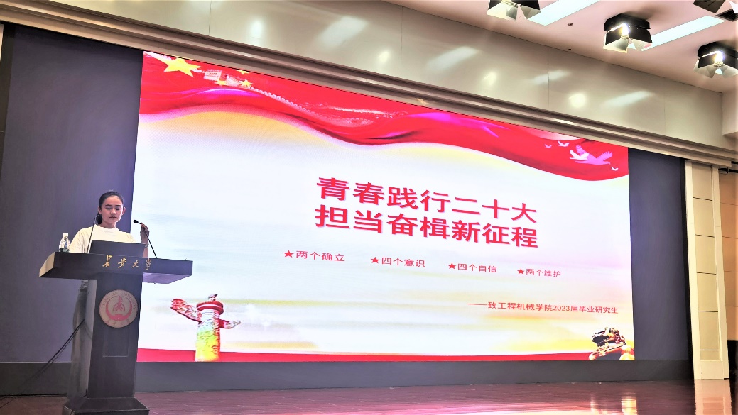 志存高远,勇担使命。会议开始高婷婷作“青春践行二十大,担当奋楫新征程”主题教育,通过“两个确立”、“四个意识”、“四个自信”、“两个维护”四个方面,号召2023届毕业研究生要勇担时代使命,牢记党的教诲,立志民族复兴,不负韶华,不负时代,不负人民,在青春的赛道上奋力奔跑,争取跑出当代青年的最好成绩!要做社会主义核心价值观的坚定信仰者、积极传播者、模范践行者,向英雄学习、向前辈学习、向榜样学习,争做堪当民族复兴重任的时代新人,在实现中华民族伟大复兴的时代潮流中踔厉奋发、勇毅前进!