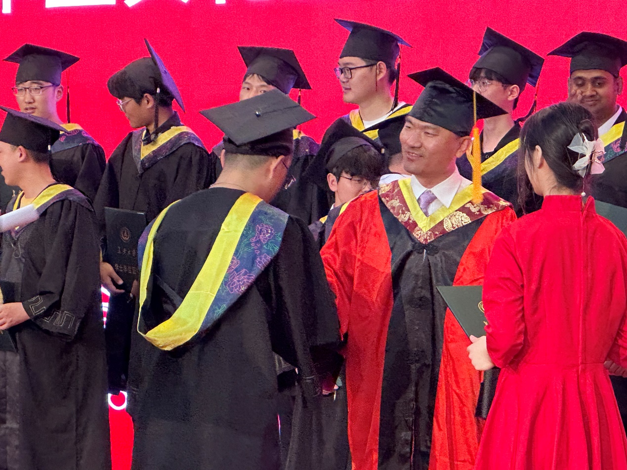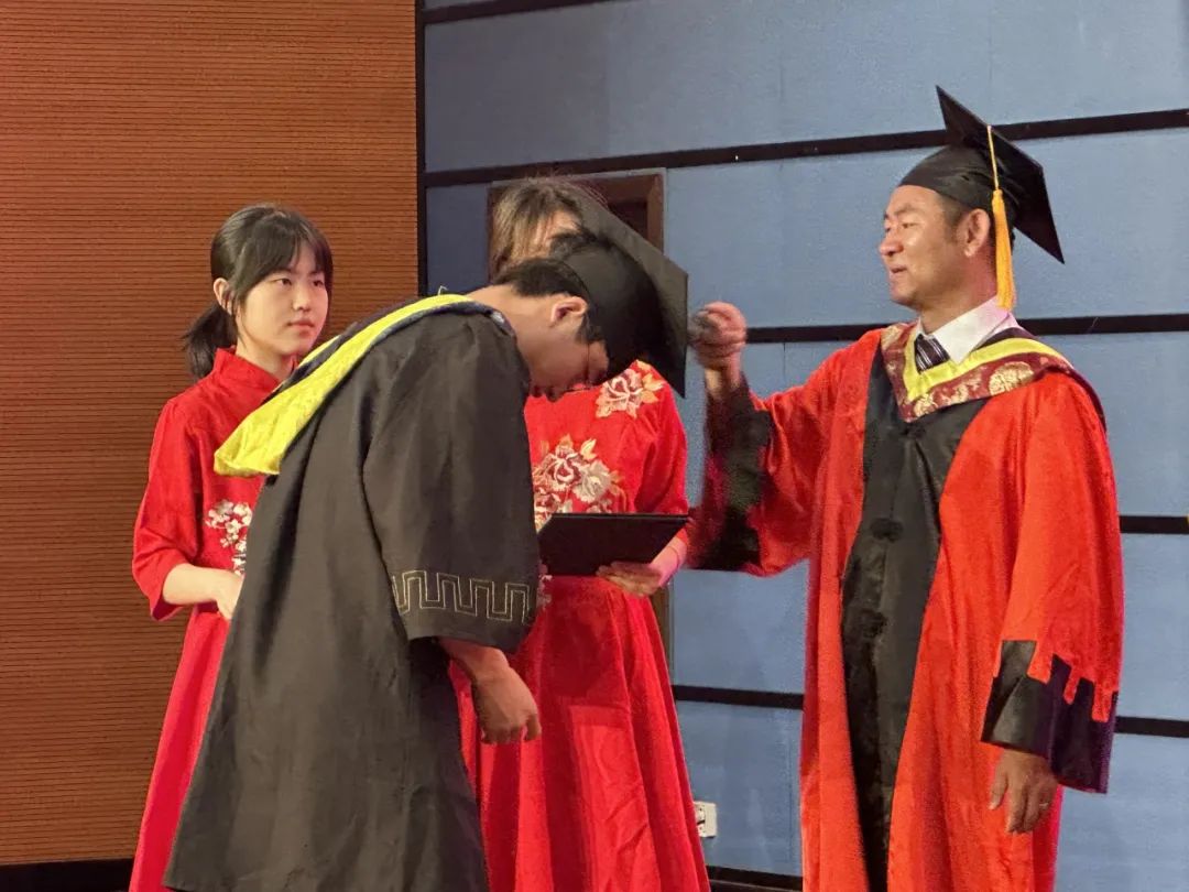 雷剑宣读学士学位授予名单,叶敏教授、张春国教授为毕业生拨穗、颁发学位证书,并与毕业生以班级为单位进行合影留念。