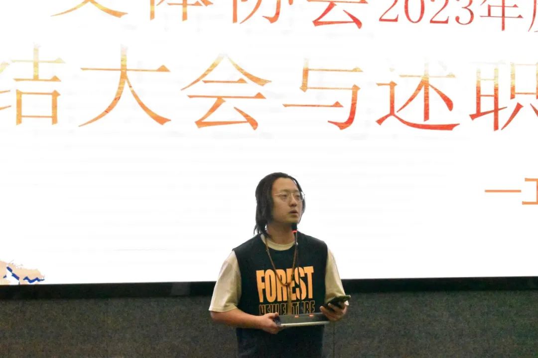 会议第一项,由文体协会2022—2023年度执行主席李一诺做述职报告,李一诺总结了文体协会在过去一年举办的活动与获得的成就,肯定了这一年来文体协会全体成员的辛勤付出,也对于社团存在的问题作出概述并提出建议,最后对文体协会的未来发展做出了美好希冀。