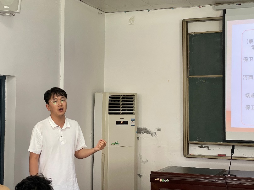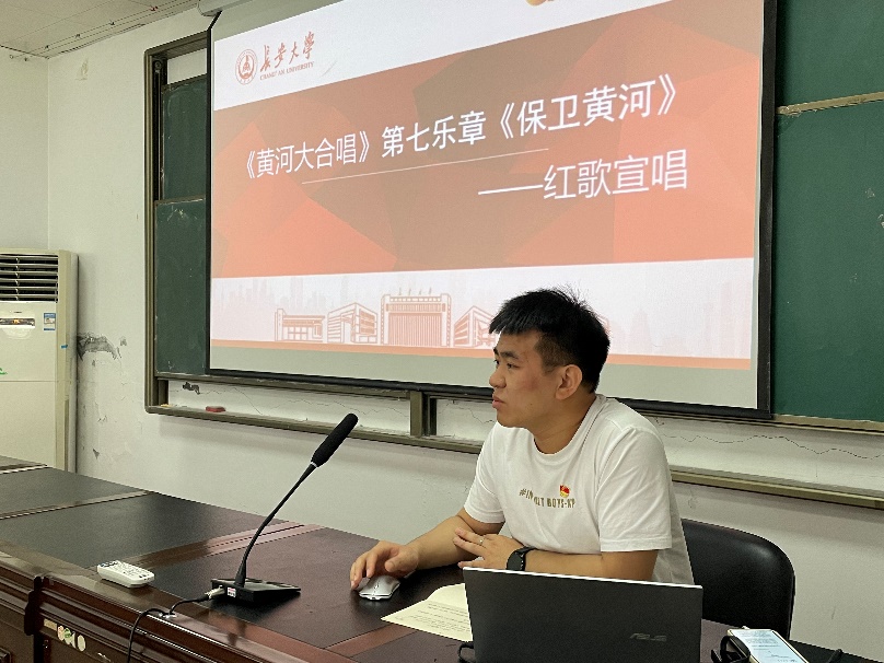 首先,宣唱团成员王驰为同学们讲解了《黄河大合唱》第七乐章《保卫黄河》。黄河是中华民族的母亲河、中华文明的摇篮。《保卫黄河》再现了革命先辈们为中华民族抛头颅、洒热血,为保家卫国而英勇战斗的壮丽场景,用激昂奋进的音乐旋律,展现了全国人民不屈不挠的顽强斗志。硝烟已远,背影犹清;使命在前,初心如磐。