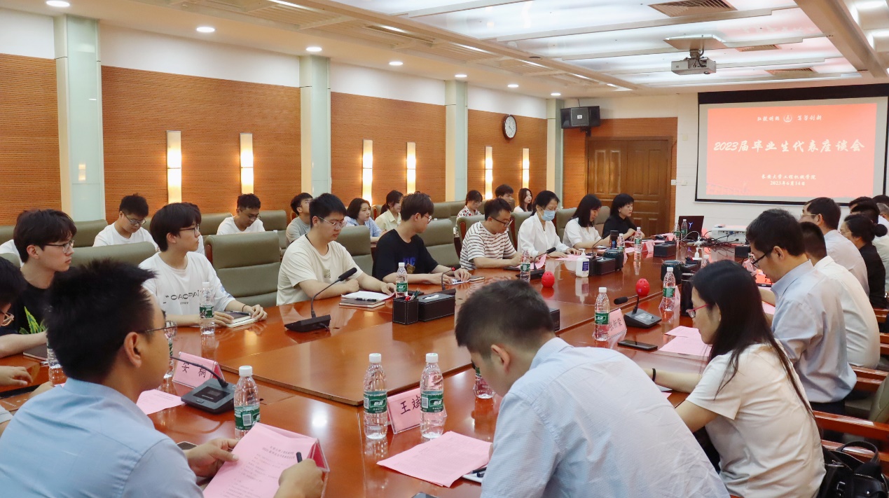 座谈交流环节,各位毕业生代表依次发言。同学们首先汇报了个人的发展去向并对学院表达了衷心的感谢,感谢师长们在学业、生活中给予的指导与帮助。雷剑表示此次座谈会旨在听取毕业生为学院发展建言献策,希望同学们开阔思路,畅所欲言。毕业生代表就课程设置、教材选用、专业分流、职业生涯规划等方面与老师们进行了沟通,希望学院能够为本科生提供更多有关学业和就业的建议和辅导,让本科生能够尽早明确目标,全力准备。参与座谈会的领导和老师们认真听取并记录下同学们的发言,对提出的问题做出了现场回应和深入探讨,表示会认真对待本次座谈会上提出的意见与建议,就相关方面给予完善和落实。与会领导和老师在认真聆听所有同学的发言之后表示,感谢大家提出的宝贵意见,学院会致力于构建常态化的师生交流机制和平台,不断改进育人工作,进一步提升育人成效。