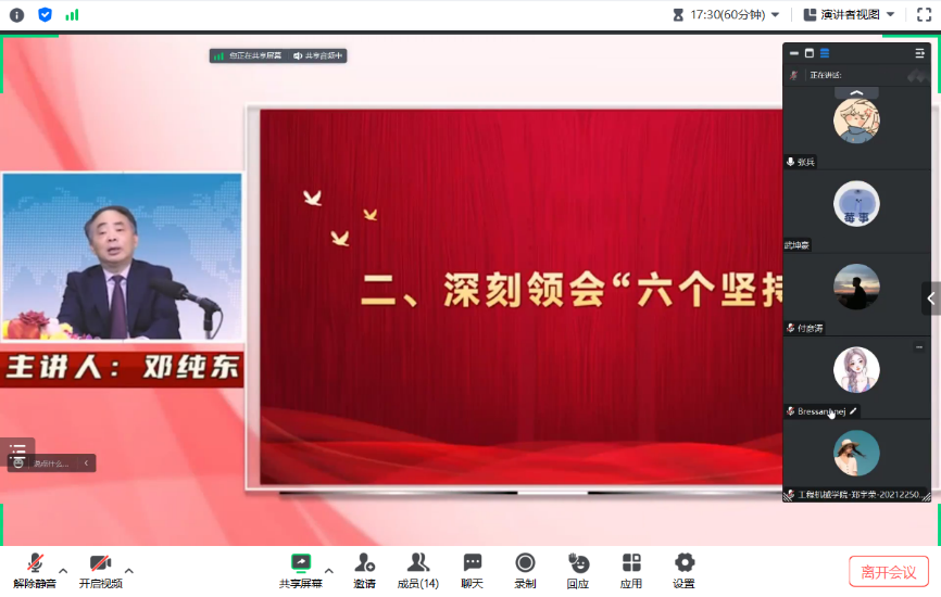 2023年7月28日,色情漫画 领航先锋研究生党支部组织支部成员线上观看了【深入开展学习贯彻习近平新时代中国特色社会主义思想主题教育】第五讲——由中国社会科学院马克思主义研究院原党委书记/院长邓纯东专题解读——《如何深刻领会“两个结合”“六个坚持”》。支部党员参加了此次活动,本次活动由支部组织委员王晨光主持。