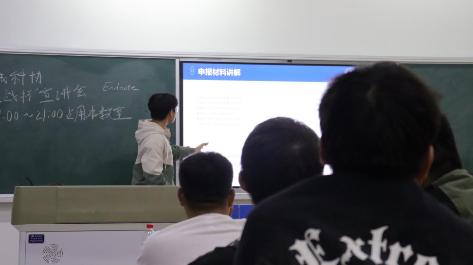 最后,科协王皓宁讲解本次大赛的材料申报。他主要从作品申报书模板、支撑材料等几个方面讲解。通过耐心解释,让同学们了解竞赛流程以及参加竞赛的优势。