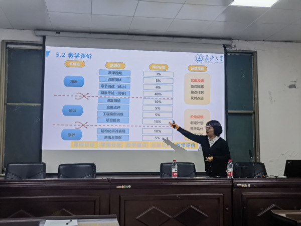 会上,程海鹰教授首先结合课程建设历程,系统介绍了课程建设思路,分享了课程教学改革经验,同时针对课程目标、学情分析、教学痛点、教学途径、教学评价等五个方面进行了细致讲解。接着,结合第五届陕西本科高校教师教学创新大赛申报要求,深入分析了教学创新大赛中的要点和难点。最后,还就自己课程建设和教学创新比赛中出现的问题提出反思及建议。