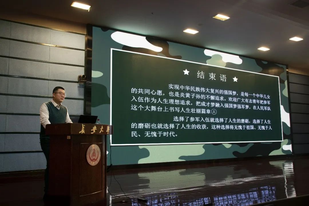 本次讲座向新生普及了我校大学生参军入伍的政策,激发了同学们投身国防的热情,鼓励同学们趁青春年少,投身军队报效祖国,实现自我价值,成就多彩人生。