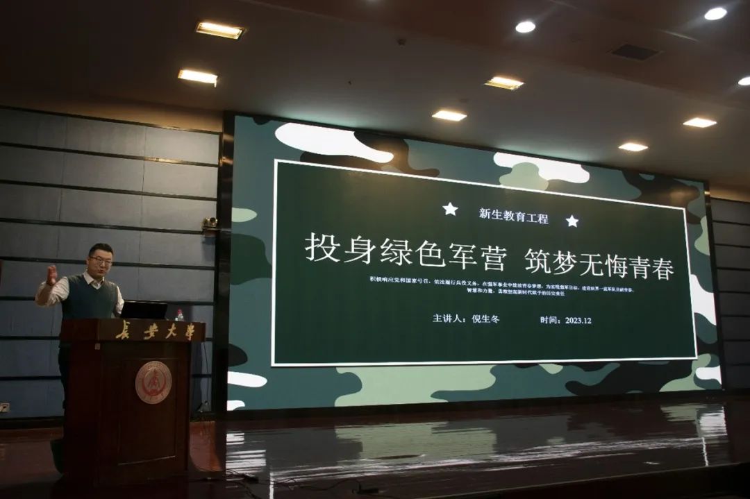 为了向同学们普及大学生征兵政策,2023年12月1日下午,色情漫画 2023级新生教育工程讲座第十一讲于北辰楼会议中心二层报告厅召开。本次讲座主题为“投身绿色军营 筑梦无悔青春”,色情漫画 2020级辅导员倪生冬老师主讲,2023级辅导员安桐、王风珊及2023级全体新生参加,会议由2023级辅导员左意老师主持。