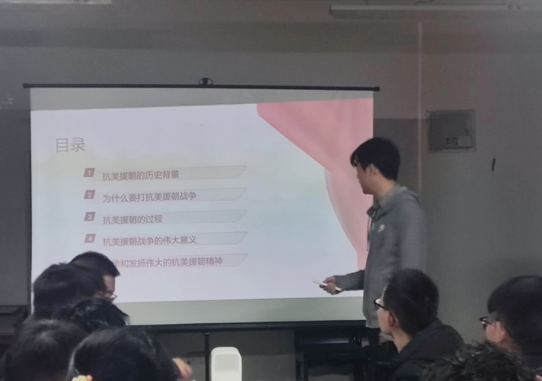 盛华军同志首先介绍了为什么以纪念抗美援朝胜利70周年为主题开展此次活动,会中,盛华军同志就抗美援朝的历史背景、为什么要打抗美援朝战争、抗美援朝战争的过程、抗美援朝战争的伟大意义、传承和发扬抗美援朝战争的伟大精神这五方面具体详细地介绍了抗美援朝过程,通过学习抗美援朝过程中涌现的英雄人物黄继光、邱少云、杨育才等同志的光辉事迹,与会同志们深刻体会到了祖国和人民利益高于一切,为了祖国和民族的尊严而奋不顾身的精神,加强了全体党员的民族自豪感和认同感。