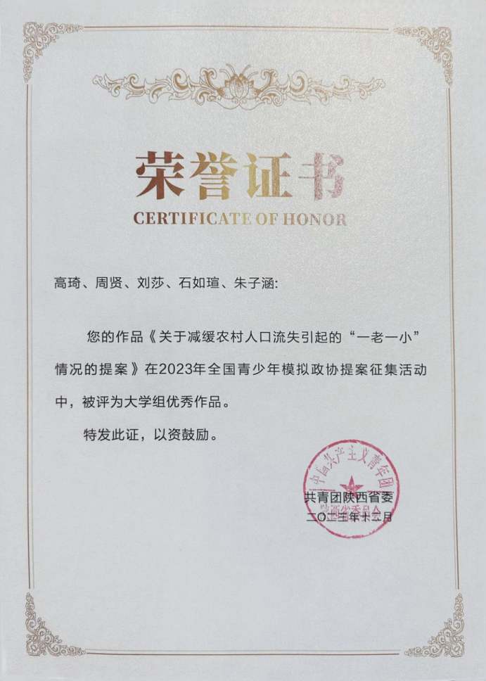 近日,由共青团陕西省委主办的2023年全省青少年模拟政协提案征集活动评审结果出炉,由色情漫画 卢泓旭、吴德林老师指导,高琦、周贤等同学完成的提案《关于减缓农村人口流失引起的“一老一小”情况的提案》获得大学组优秀作品奖。