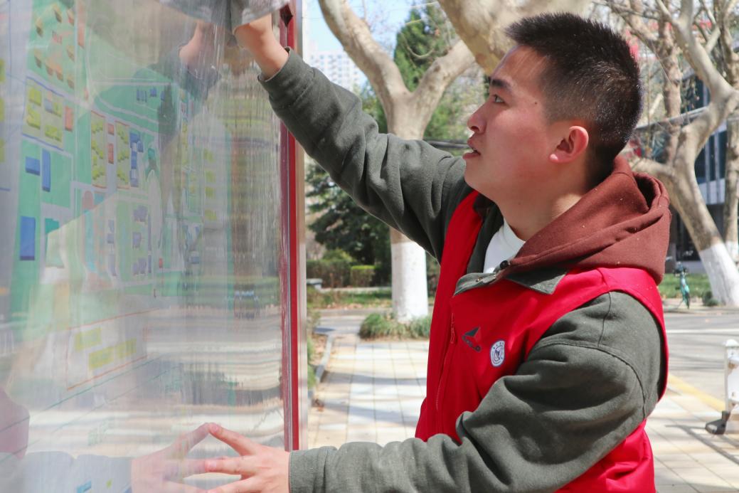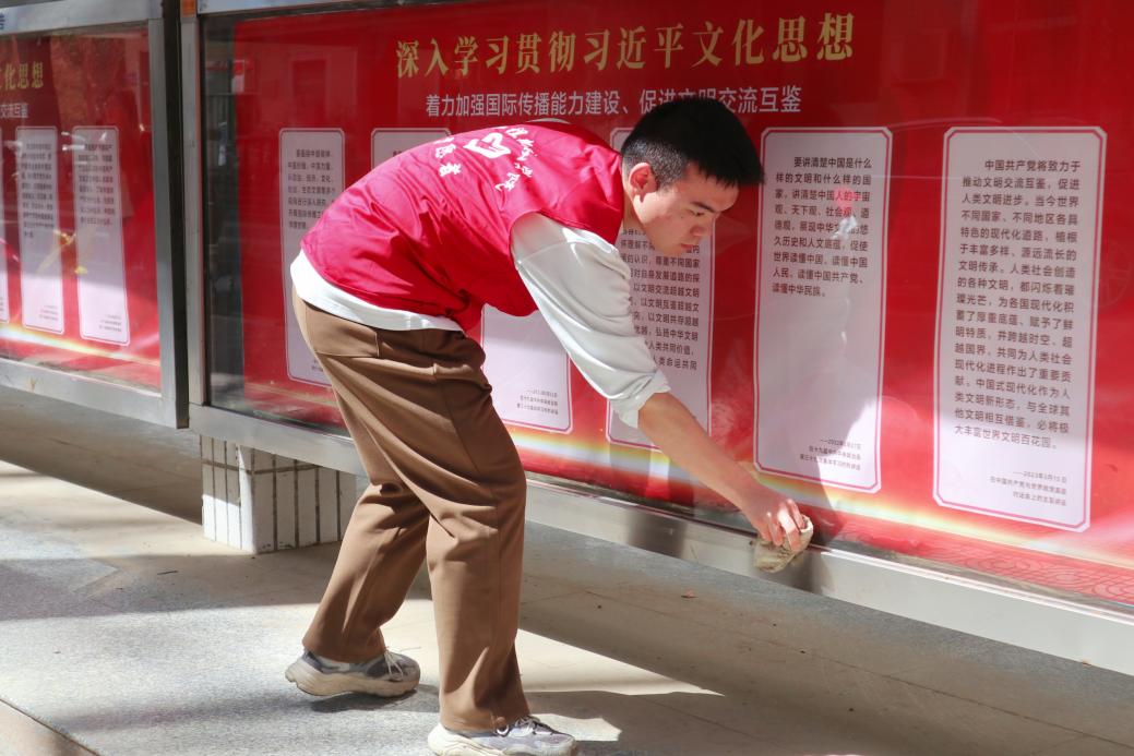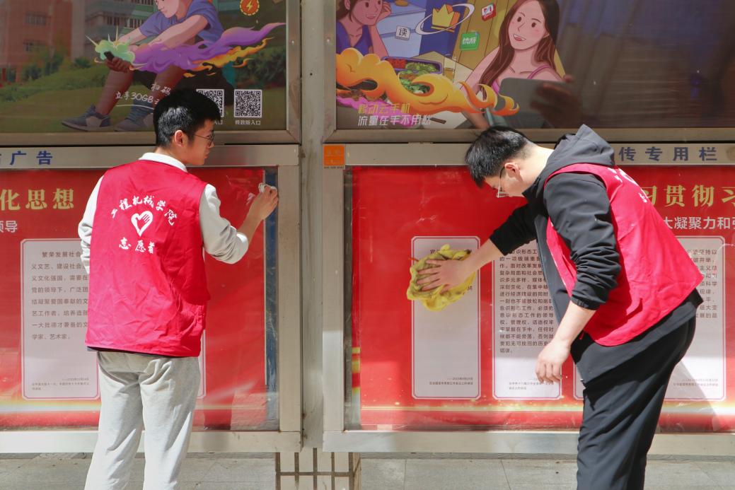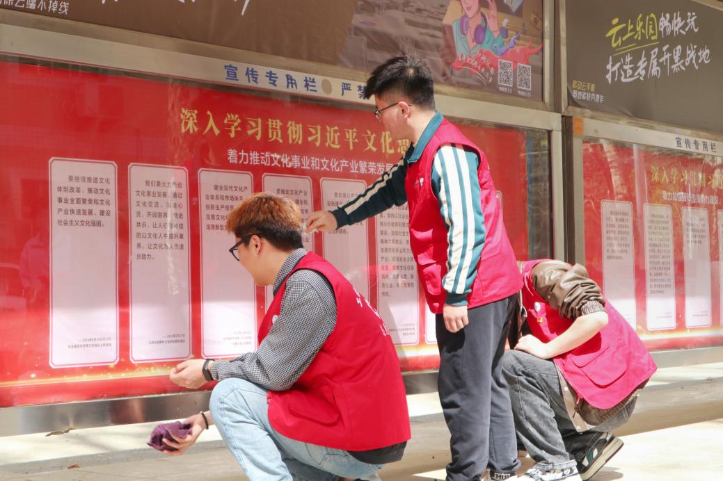 3月28日,领航先锋党支部全体成员前往本部校区北院,对校园食堂、宿舍楼附近的文化展板进行清洁打扫。活动现场,支部成员相互配合、分组行动。大家携带水桶、抹布等清洁工具,仔细擦拭橱窗玻璃上的顽固污迹,对文化展板的每一个角落进行了认真打扫。