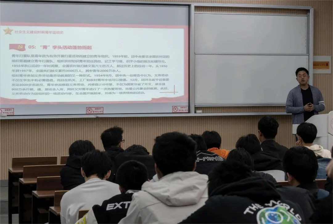 首先,学院团委副书记安桐为学生讲授主题团课。他围绕着“追寻信仰之光·勇担青春使命”这个主题,重点讲解了新民主主义革命时期青年运动史、社会主义建设时期青年运动史、改革开放三个阶段的历史背景、主要内容及重要意义。最后结合工作实际,向大家讲述了广大青年团员应该如何发扬五四精神,并鼓励大家争做有理想、敢担当、能吃苦、肯奋斗的新时代青年。