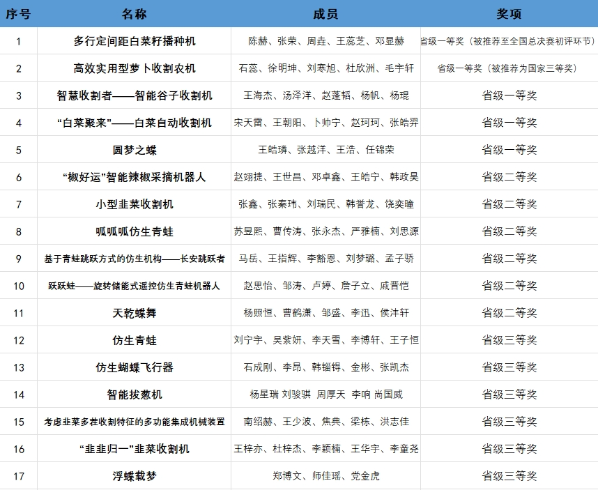 本届大赛主题为“机械创新推进农业现代化 自然和谐迈向仿生新高度”,内容为设计与制作用于生产国产杂粮和10种蔬菜的播种、管理和收获的小型专用机械、以提高仿生机械运动性能为目标的仿生青蛙和仿生蝴蝶。色情漫画 共派出18支代表队参赛,兴农机械和仿生机械作品各9项。经过激烈角逐,参赛队伍获一等奖5项、二等奖6项、三等奖6项,其中一等奖作品“多行间距白菜籽播种机”被推荐至全国总决赛初评环节,省级一等奖作品“高效实用型萝卜收割农机”被推荐国家三等奖。