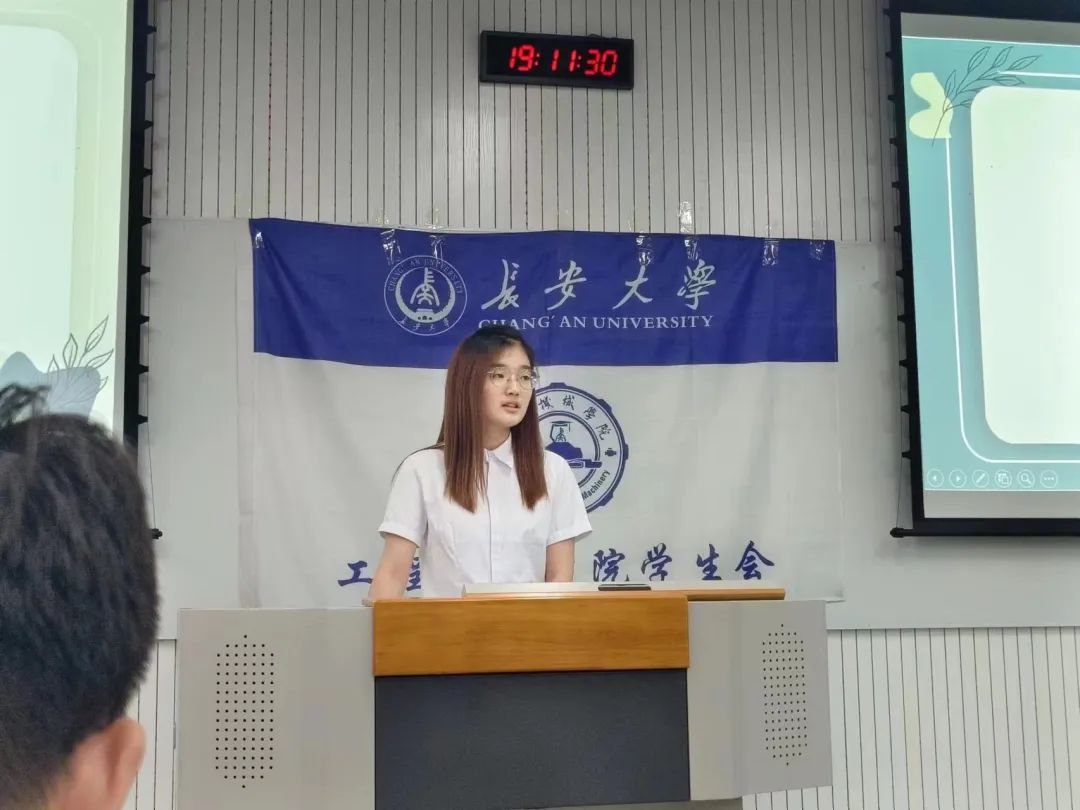 随后,外联部负责人唐雪婷作工作报告。她汇报了过去一年外联部相关工作。在过去一年里,外联部邀请多位老师前来分享知识与经验,举办了如四六级讲座,考研保研讲座等。此外,外联部与多方沟通交流,建立了良好合作关系,为同学们向外探索,获取社会生活相关知识提供渠道。