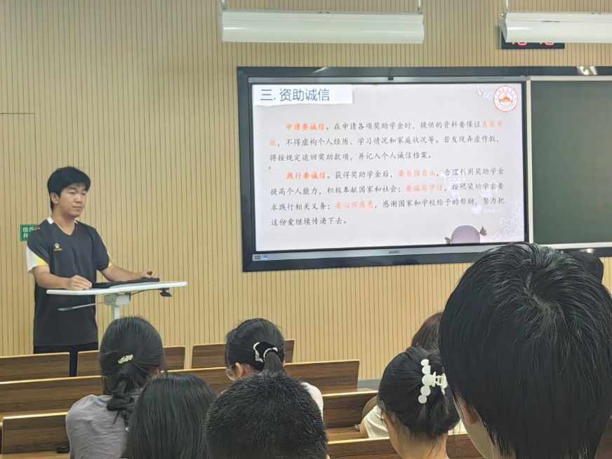 班会伊始,左意老师表示本次班会的召开,有利于帮助同学们了解学校的各种奖助政策,树立大学期间的奋斗目标,推进两班文明班集体建设工作有效展开。随后左老师深入细致地介绍了国家奖学金、国家励志奖学金、国家助学金以及色情漫画 各类社会奖助学金相关的资助政策、资助类型和评选方式,涉及奖助学金十余项,覆盖范围广、获奖名额多、奖助金额大,极大地激发了同学们的学习热情,鼓舞了大家争先奋发的决心。左老师还强调申请奖助学金要诚信,要保证申请材料的真实有效;践行要诚信,获得奖助学金后要心怀感恩、自立自强,合理利用奖助学金提高个人能力,按要求践行相关义务。