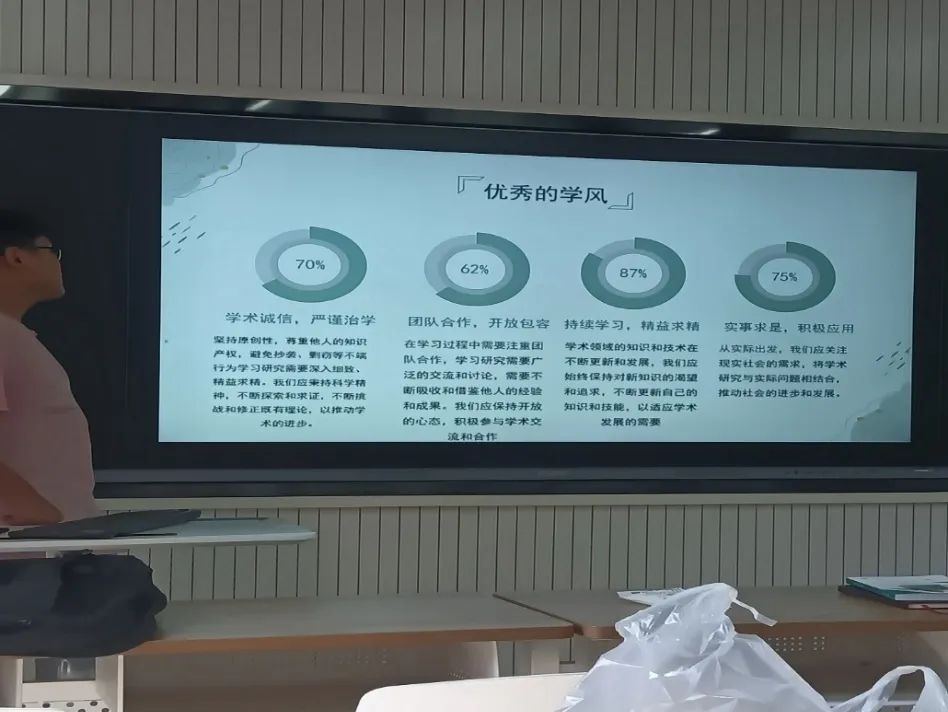 随后,袁帅韬向大家解读了优秀学风的内涵,希望大家都能朝着这个方向不断努力。此外,袁帅韬还表示班级同学本学期的总体成绩较上学期有较大进步。为进一步树立良好的班级学风,自本周开始将继续开展晚自习,希望大家能自觉遵守、互帮互助,争取打造更优秀的班集体。最后,袁帅韬向同学们展示了学院公布的作弊通报和《学生手册》中关于本校考试作弊违规的处分方法,再次呼吁同学们诚信考试、远离作弊。