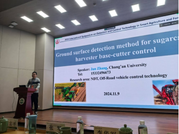 会议中,张军副教授发表了题为“甘蔗收割机切刀智能控制的地面检测方法”的演讲。张军副教授首先介绍了利用探地雷达(GPR)进行检测的方法。该技术通过在甘蔗收割机上安装GPR,并通过正反演试验验证了其有效性。即便在模拟甘蔗地中存在石头、杂草等复杂情况下,GPR仍能保持高精度检测。尽管GPR作为一种高效的无损检测方法,其高昂的成本促使研究团队提出了另一种接触式测量方法,并通过试验验证了其可行性。此外,他还提出了自适应控制系统的设计,并在广西的农场进行了现场试验。通过将多个传感器集成至甘蔗收割机,并进行机电液联合仿真,最终在甘蔗收割的检测与控制方面验证了该方法的有效性。
