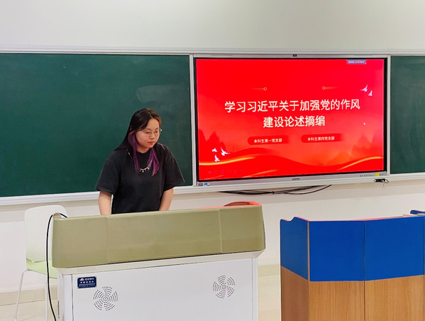 随后,在高歌同学的引领下,全体党员围绕《习近平关于加强党的作风建设论述摘编》展开重点学习。她从《习近平关于加强党的作风建设论述摘编》的核心定位与价值、出版背景与时代意义、党的作风建设重要性、党的作风建设具体要求及实践路径等方面带领大家进行了深入学习,并倡导党员们不断增强自我革命意识,在日常学习生活中严格要求自己,深刻领悟“打铁还需自身硬”的内涵。