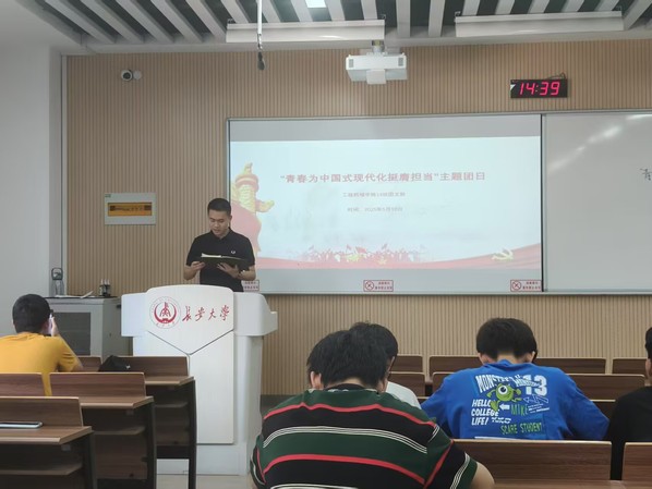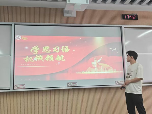 2024250012班团支部举办“学思习语 机械领航”主题团日活动,团支书仇景昊围绕习近平新时代中国特色社会主义思想展开学习,解读了人民观、生态文明思想等重要理念。