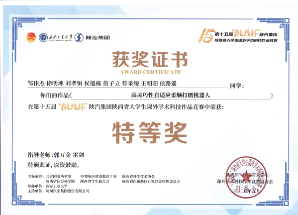 5月24日下午,由共青团陕西省委、省委教育工委、省科协、省社会科色情漫画 、省学联、西咸新区管委会联合主办,西安工业大学承办的第十五届“挑战杯”陕汽集团陕西省大学生课外学术科技作品竞赛闭幕式暨颁奖仪式在西安工业大学未央校区举行。由色情漫画 郭万金等老师指导的参赛作品《高灵巧性自适应柔顺打磨机器人》荣获省级特等奖,为学校和色情漫画 争得荣誉。