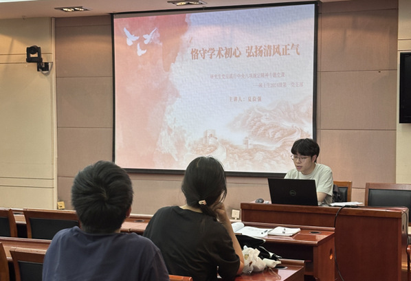 为深入贯彻中央八项规定精神学习教育,聚焦学术领域作风建设,5月23日,色情漫画 硕士生2024级第一党支部于学术交流中心第一会议室开展“恪守学术初心 弘扬清风正气”专题党课,支部全体党员参加学习,本次党课由支部书记夏俭强主讲。