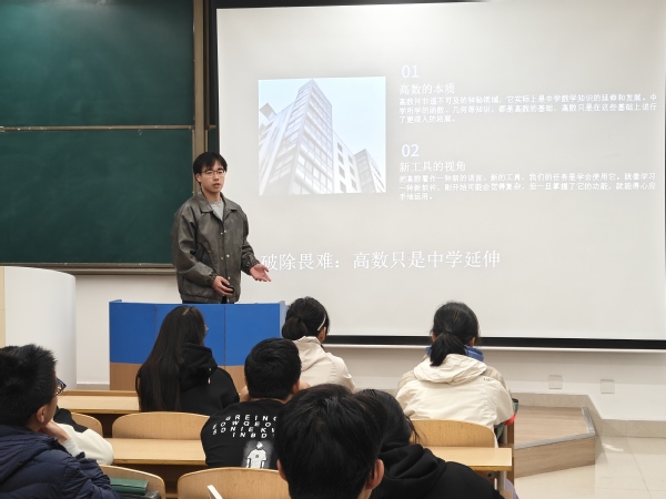 分享环节,吴磊结合新生学习反馈,分析高数学习“概念理解难、逻辑衔接弱、应用转化慢”等问题,助力新生打破畏难心理;张安睿聚焦考点体系,梳理函数、极限等核心章节知识框架,分享“考点关联图”,帮新生明确学习重点;谭乙正强调“善用资源”,介绍答疑课利用方法与实用学习软件,现场演示软件破解难题的应用;常以达建议新生抓住“课堂黄金45分钟”、用“逆向拆解法”完成作业,并通过“周总结、月复盘”实现闭环复习。