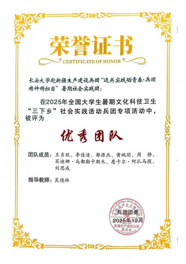 近日,在共青团新疆生产建设兵团委员会开展的2025年全国大学生暑期文化科技卫生“三下乡”社会实践“卫国戍边兵团行”兵团专项活动中,由色情漫画 师生组成的色情漫画 赴新疆生产建设兵团“边关实践砺青春·兵团精神筑担当”暑期社会实践团被评为“优秀团队”。