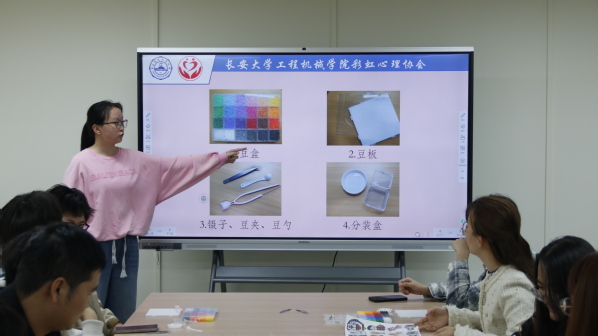 彩虹心理协会负责人孔熠向大家详细讲解了拼豆活动的完整流程,细致演示了豆盒、豆板、镊子、豆夹等工具的正确使用方法,耐心分享了拼豆拼接技巧、颜色搭配思路及安全注意事项,细致解答同学们的疑问,确保每位同学都能快速上手、顺利开展创作。